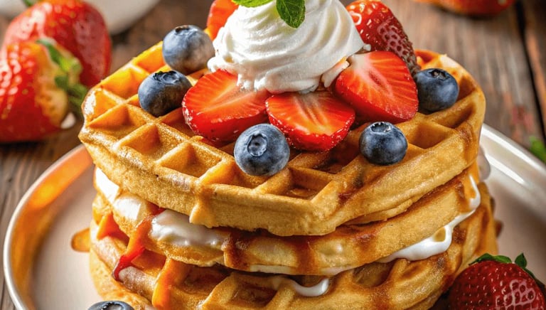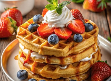 Savor our golden Belgian waffles topped with fresh fruits and premium sauces.