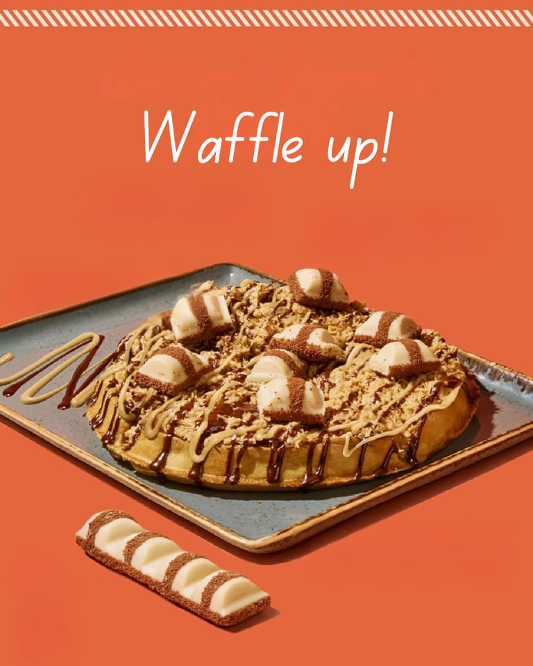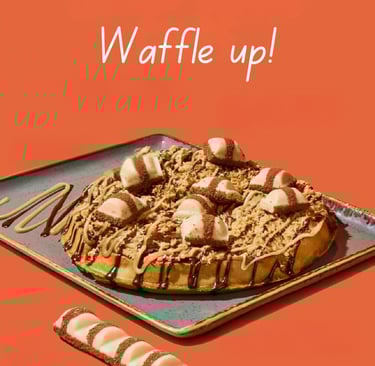 A cozy, dessert-inspired waffle topped with apple compote, honey, cinnamon, and white chocolate sauce.